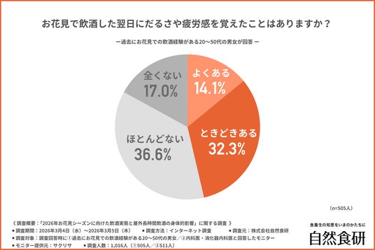 「お花見で飲酒した翌日にだるさや疲労感を覚えたことはあるか」について尋ねたところ、約半数が『よくある(14.1%)』『ときどきある(32.3%)』という結果となりました。