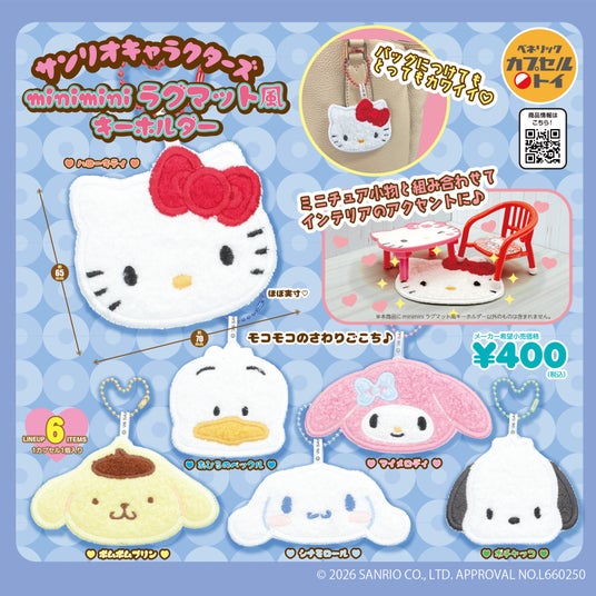 ボールチェーン付きで、バッグなどに付けるとファッションのアクセントになり、ボールチェーンを外してお手持ちのミニチュアアイテムと並べれば、実際のラグマットのように飾れます。また、「サンリオキャラクターズ minimini折りたたみテーブル2」と組み合わせて飾ると、サンリオキャラクターズに囲まれた小さなお部屋を表現できます。