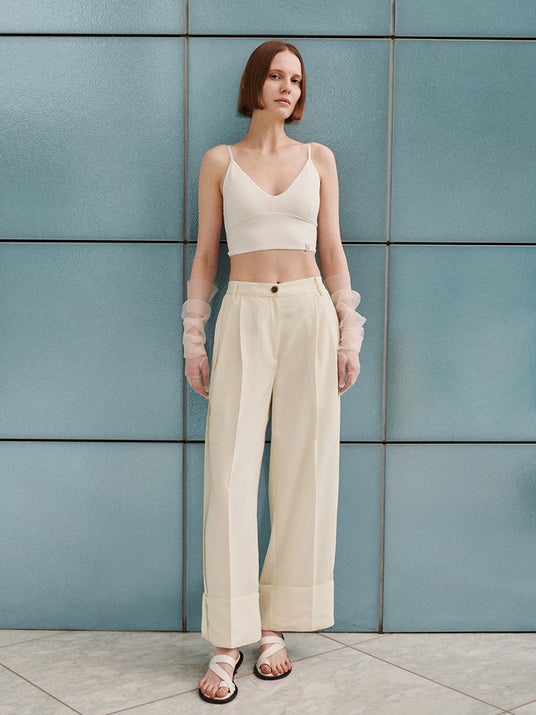 胸元のカットラインが上品な、カップ付きショート丈キャミソールインナー。