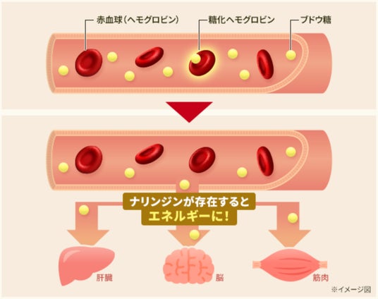 そこで、ナリンジンが糖をエネルギー源に変えることで血管内の糖の量を減らし、ヘモグロビンA1c値の低下をサポートします。