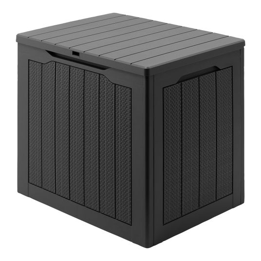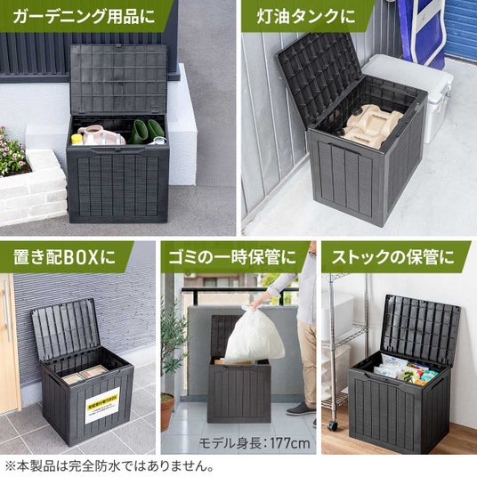 直射日光や屋外環境にさらされる収納用品は、素材選びが使い勝手を左右します。本製品は耐光材を練り込んだ樹脂を採用しており、屋外でも劣化しにくい仕様です。ブラックカラーの落ち着いたデザインは、ベランダや玄関まわりにもなじみやすく、見た目にもすっきり。収納力だけでなく、長く使いやすい素材とデザイン性を両立した一台です。
