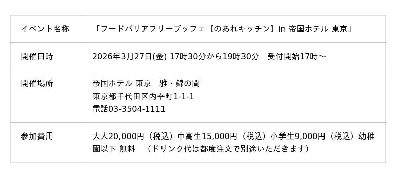 食物アレルギーを引き起こす特定原材料8品目と全てのナッツ類を使用しない「フードバリアフリーブッフェ 【のあれキッチン】in 帝国 ホテル東京」「のあれキッチン」アライアンス事業説明会を同時開催します