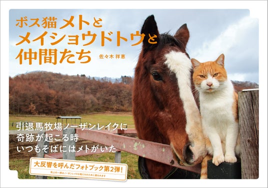 北海道新冠(にいかっぷ)町にある引退馬牧場「ノーザンレイク」を舞台に、大人気のGIホースの「メイショウドトウ」(認定NPO法人引退馬協会所有)と茶白のオス猫「メト」の交流を描いたフォトブック第2弾『ボス猫メトとメイショウドトウと仲間たち』が、メイショウドトウ満30歳の誕生日、2026年3月25日に発売されます。