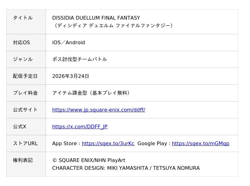 株式会社スクウェア・エニックス(本社:東京都新宿区、代表取締役社長:桐生 隆司、以下スクウェア・エニックス)は、NHN PlayArt 株式会社(本社:東京都港区、代表取締役社長:丁 佑鎭、以下 NHN PlayArt)と共同開発を手掛ける新作スマートフォン向けゲーム『ディシディア デュエルム ファイナルファンタジー』において、2026年3月24日(火)にサービス開始することが決定いたしました。この発表にあわせて本作の「ファイナルトレーラー」を公開。さらにサービス開始日決定を記念してオリジナルグッズが当たるプレゼントキャンペーンを開催したことをお知らせいたします。