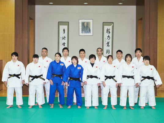 嘉納治五郎師範の肖像画と「精力善用」「自他共栄」の掛け軸が掲げられた道場にて。ZONE柔道着を着用した日本視覚障害者柔道代表チームの集合写真。