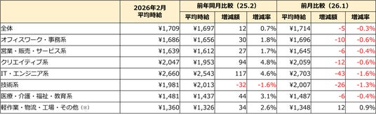 2026年2月度の三大都市圏平均時給は1,709円(前月比-5円・0.3%減、前年同月比+12円・0.7%増)でした。前年同月を上回るのは41ヵ月連続です。オフィスワーク・事務系は、1,686円(前年同月比+30円、前月比-10円)となりました。4月入職に向けて求人が年間で最も増加する時期を迎え、専門スキルを要する高時給の求人が登場した一方で、未経験から応募可能な選挙関連の事務といった求人も増加。幅広い層向けの求人が増えたことで全体の平均時給は前月比で微減となりました。