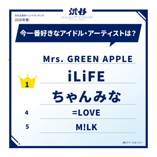 今回は、不動の人気を誇る「Mrs. GREEN APPLE」に加え、熱狂的な支持を広げるアイドルグループ「iLiFE!」、そしてプロデューサーとしても手腕を発揮する「ちゃんみな」の3組が同率1位に輝きました。「Mrs. GREEN APPLE」は、「神曲が多く、心にグッと刺さるものがある」(高1・男子)といったコメントが目立ちます。メンバー個々のメディア露出や俳優活動が広がるなか、常に期待を上回る圧倒的な歌唱力と、キャッチーな楽曲制作を両立させている点が、高校生からの厚い信頼に繋がっているようです。「iLiFE!」は、「とにかく可愛くて憧れる」といった女子高校生からの熱い支持を集めました。一方の「ちゃんみな」は、「強くて面白くてかっこいい」(高1・女子)という声に象徴されるように、彼女自身の生き方や揺るぎない考え方そのものが、憧れの対象として支持されている様子がうかがえます。