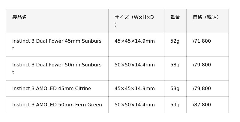 - その他機能:通知機能、Suica・Garmin Pay、天気情報、事故・転倒検出機能、スマホ探索など
