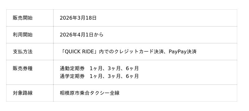 レシップホールディングス株式会社(本社:岐阜県本巣市、代表取締役社長:杉本 眞)の連結子会社であるレシップ株式会社(本社:岐阜県本巣市、代表取締役社長:北野 元昭)は、相模原市(本庁:神奈川県相模原市、市長:本村 賢太郎)が運営する相模原市の乗合タクシーにおいて、スマホ乗車券アプリ「QUICK RIDE」を導入し、2026年3月18日より「定期券」の取扱いを開始することをお知らせいたします。