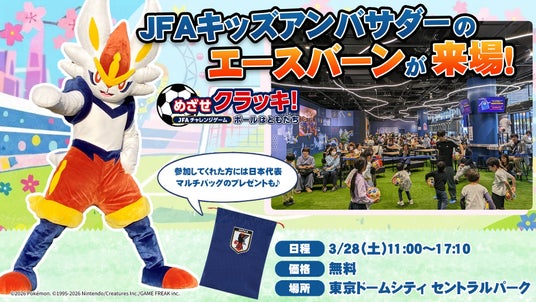 当日は、JFAキッズアンバサダーのエースバーンが遊びに来てくれます。参加していただいた方には、日本代表マルチバッグのプレゼントも!サッカーが初めてのお子さまでも楽しめるチャレンジがいっぱいです。