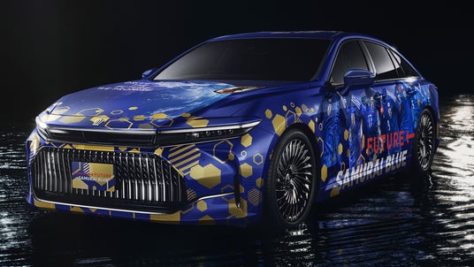 サッカー日本代表を応援する特別なクルマ「SAMURAI BLUE TO THE FUTURE」が東京ドームシティに登場します。車体はBLUE(青)を基調に、歴代の日本代表ユニフォームをモチーフにしたラッピングが施されています。