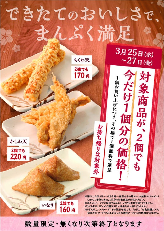 株式会社丸亀製麺(本社:東京都渋谷区、代表取締役社長:山口 寛)が展開する、食の感動体験を探求し、手づくり・できたてにこだわる讃岐うどん専門店「丸亀製麺」は、2026年3月25日(水)~3月27日(金)の3日間、丸亀製麺で人気の『ちくわ天』『かしわ天』『いなり』をそれぞれ1個ご購入いただくと、その場で1個無料で進呈します。打ち立てのうどんと一緒に楽しんでいただきたいという想いから、店内飲食のみ対象となります。春休みが始まるこの時期に、ご家族・ご友人と一緒に、毎日お店で国産小麦、塩、水のみからつくるうどんと合わせて、できたてのおいしさをお楽しみください。