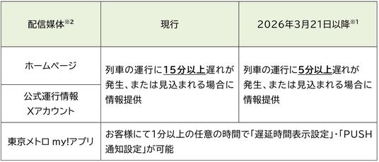 東京地下鉄株式会社(本社:東京都台東区、代表取締役社長:小坂 彰洋、以下「東京メトロ」)は、2026年3月21日(土)※1より順次、運行情報の配信基準を大幅に拡充し、よりきめ細やかな情報提供を開始いたします。