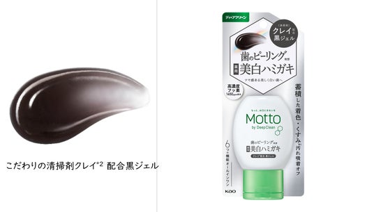 そこで「ディープクリーン」は、歯や歯ぐきの健康を守りながら、見た目の変化を気にする生活者の悩みや不安に寄り添った、新たな価値を提案する新シリーズ「Motto by Deep Clean」を立ち上げ、『Motto by Deep Clean 黒ジェル美白ハミガキ』<医薬部外品>を発売いたします。