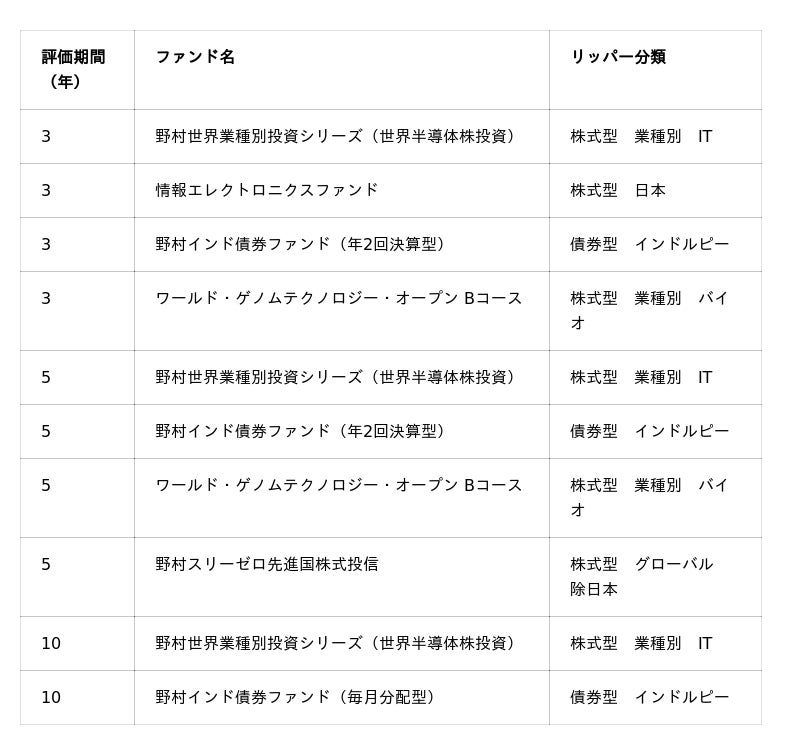 最優秀ファンド賞は評価期間ごとに賞が設けられており、投資信託部門では「野村世界業種別投資シリーズ(世界半導体株投資)」など6ファンドが10の受賞、確定拠出年金部門では「野村世界ESG株式インデックスファンド(確定拠出年金向け)」など4ファンドが6の受賞と、合計16の受賞を果たしました。