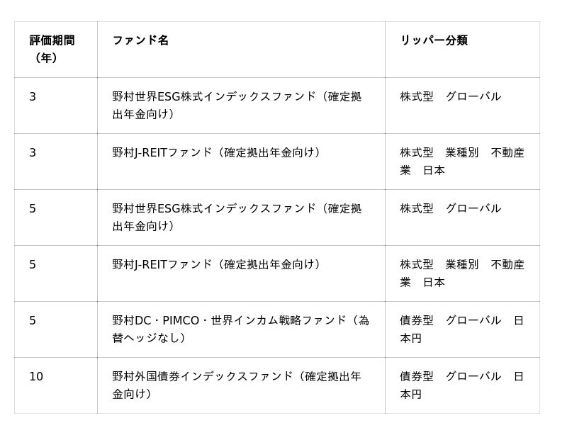 野村アセットマネジメント株式会社(CEO兼代表取締役社長:小池広靖、以下「当社」)は本日、「LSEG リッパー・ファンド・アワード 2026 ジャパン」において、確定拠出年金 総合部門・債券部門で最優秀会社賞を受賞しました(債券部門は3年連続の受賞)。また、投資信託部門および確定拠出年金部門で最優秀ファンド賞を受賞しました。