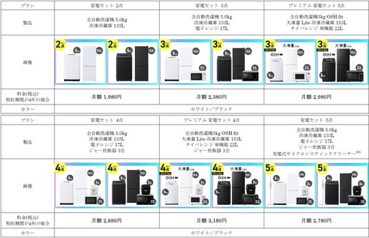 「プレミアム 家電セット 2点/3点/4点/5点」にそれぞれホワイト/ブラック2色をラインアップ。