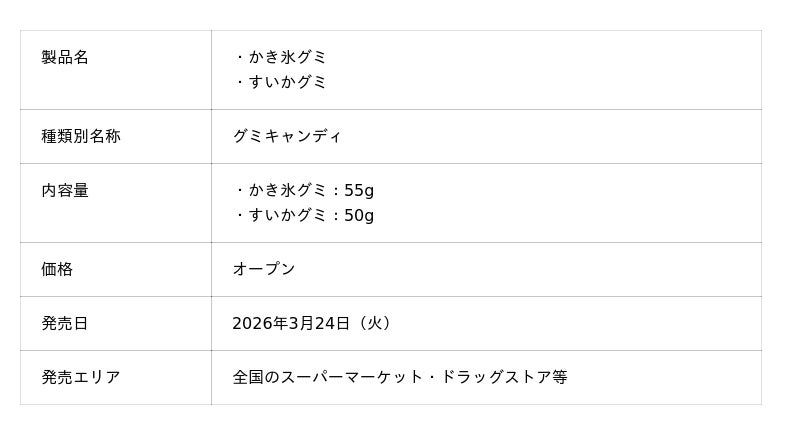 当社は本製品を通じて、夏の到来を感じるひとときや親子の会話が生まれる時間の創出に貢献するとともに、夏の定番グミとしての存在感をさらに高め、世代を超えて愛される製品としての定着を図ります。