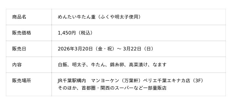 株式会社リエイグループの株式会社リエイ(本社:千葉県浦安市、代表取締役:椛澤 一)が展開する千葉県の老舗駅弁ブランド「マンヨーケン(万葉軒)」は、新商品となる駅弁『めんたい牛たん重(ふくや明太子使用)』を2026年3月20日(金)から3月22日(日)まで、期間限定で販売いたします。