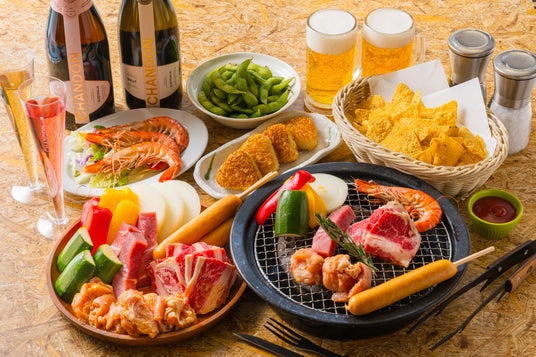 【コース内容】枝豆・トルティーヤ・牛カルビ・豚肩ロース・ジャークチキン・フランクフルト・ズッキーニ・玉ねぎ・パプリカ・焼きおにぎり
