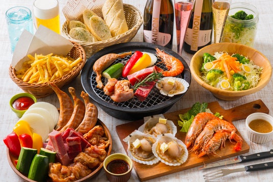 【コース内容】ジャーサラダ・スカイリゾートポテト・牛肩ロース・豚肩ロース・有頭海老・ジャークチキン・骨付きフランク・ホタテバター・ズッキーニ・玉ねぎ・パプリカ・ガーリックバケット