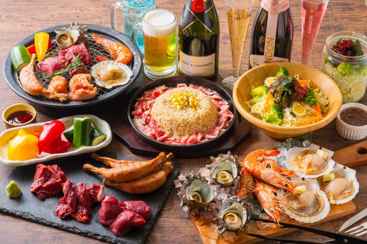 【コース内容】ジャーサラダ・牛タン・ザブトン・有頭海老・骨付きフランク・牛ハラミ・サザエ・ズッキーニ・ホタテ・パプリカ・ビーフペッパーライス