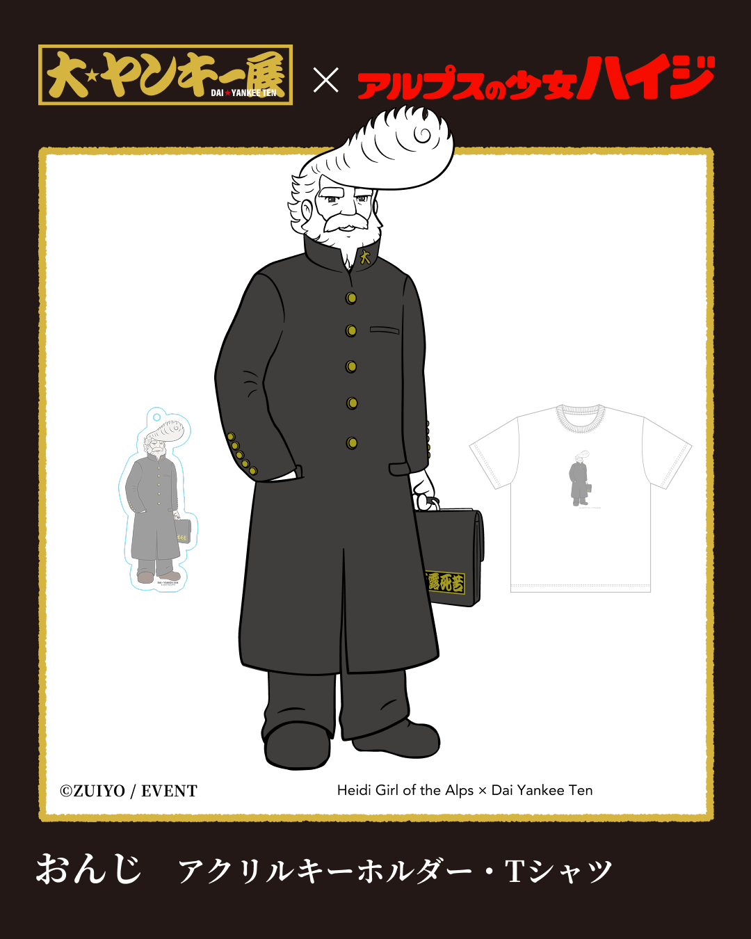 ハイジコラボグッズはTシャツ・キーホルダーの2種類展開、特にリーゼントに長ランというヤンキースタイルになった「おんじ」はインパクト抜群!