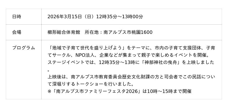 一般社団法人日本昔ばなし協会が取り組む「海ノ民話のまちプロジェクト」は、3月15日(日)に、『南アルプス市ファミリーフェスタ』内で「神部神社の曳舟」の上映会を実施しました。