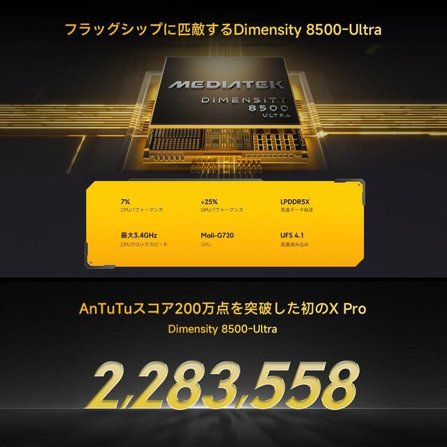 本製品は、Dimensity 8500-Ultraを搭載し、フラッグシップモデルに匹敵するパフォーマンスを実現しています。アプリの起動や切り替え、動画視聴やゲームなどもスムーズにこなせるため、日常使いからエンタメまで幅広く対応。
