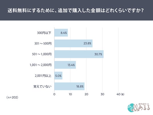調査の結果、7割以上が送料無料ラインに届かせるため商品を追加購入した経験があるとわかり、金額は1,000円以内が5割以上となりました。