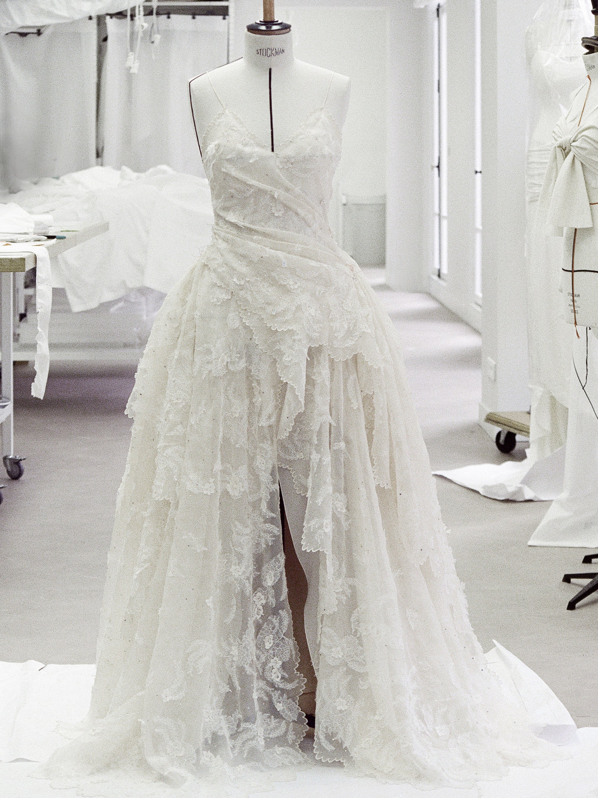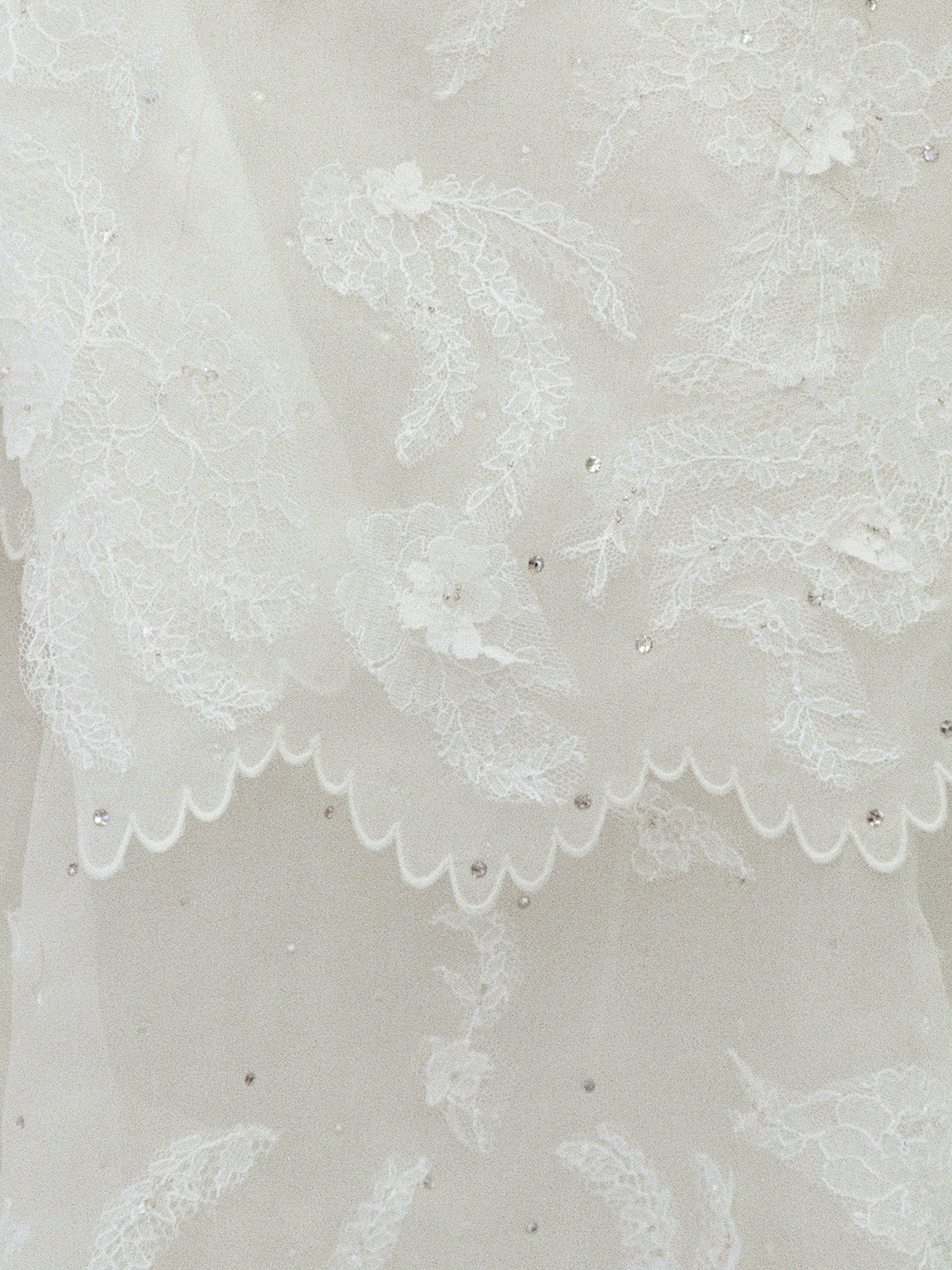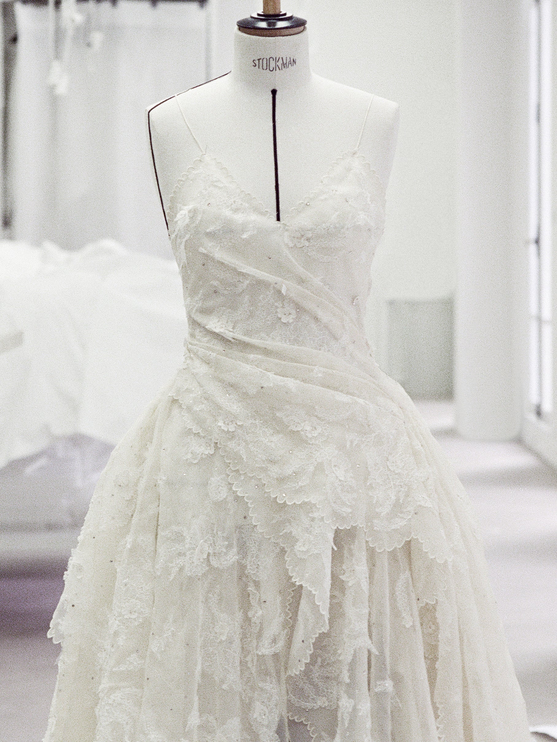 ミア・ゴスは、ポルカドットとレースの花柄の刺繍が施された、アイボリーシルク オーガンザドレスを纏いました。