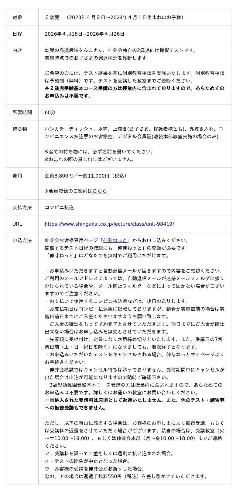 株式会社リソー教育(本社:東京都豊島区、代表取締役:天坊真彦)の子会社である、株式会社伸芽会(本社:東京都豊島区、代表取締役:中西克弥)は、幼児の発達段階をふまえた、伸芽会独自の2歳児向け模擬テストを実施いたします。ご希望の方には、テスト結果をもとに個別教育相談を実施いたします。ぜひお申し込みください。