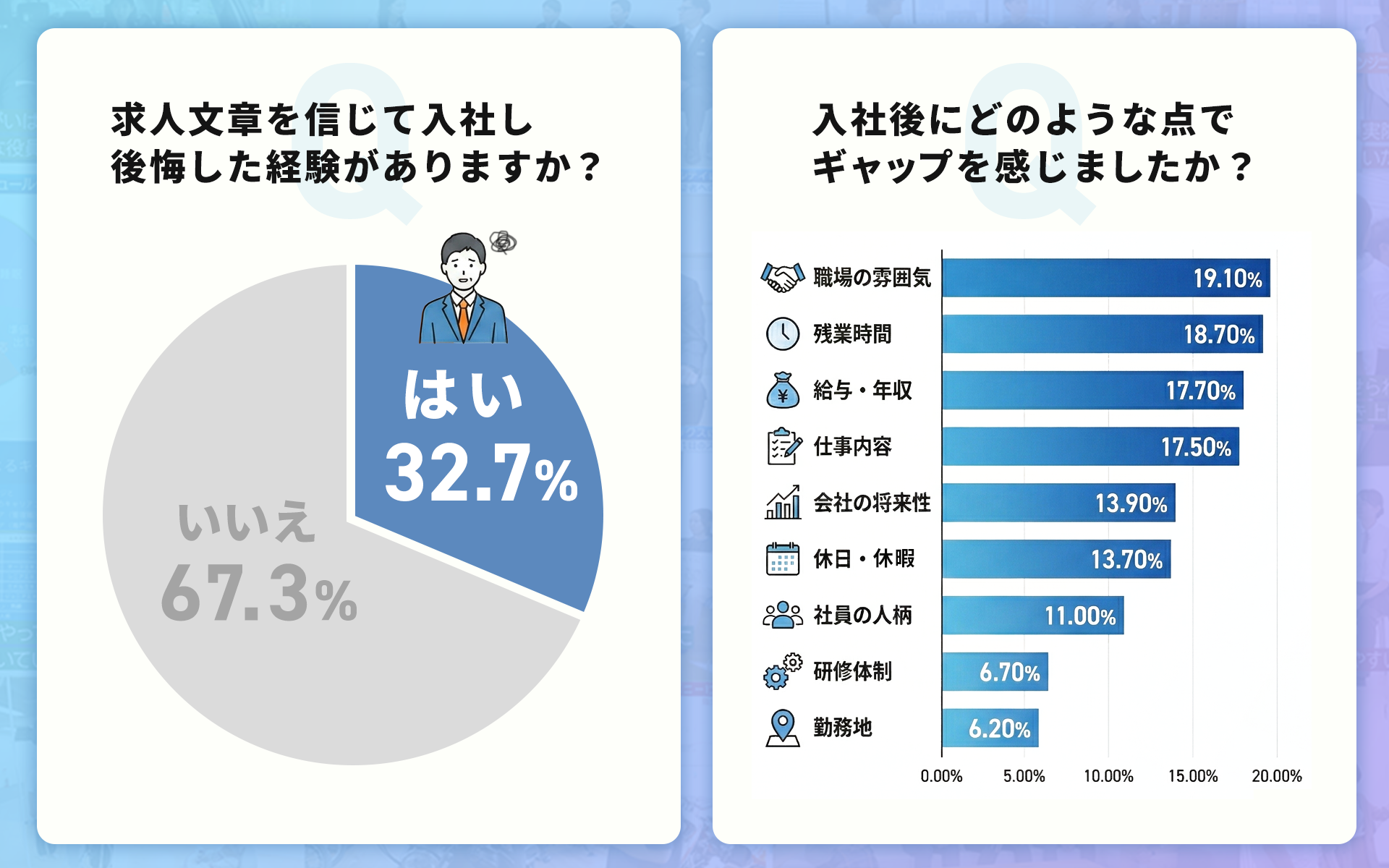 結果として、入社後に「思っていたものと違った」と感じる求職者が後を絶ちません。当社が行ったアンケート調査(※)では「求人文章を信じて入社した後に後悔した経験があるかどうか」という質問に対して、実に32.7%もの人が「はい」と回答しています。
