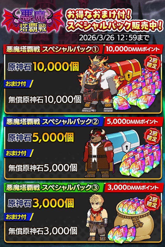 2回購入限定のお得な原神石が入手可能な「悪魔塔覇戦スペシャルパック」が3種登場! また、「グルガーズ」と「エフタ」の育成に役立つアイテムがおまけに付いた1回購入限定の育成促進パックがそれぞれ登場! 期間限定販売のお得な機会をお見逃しなく!