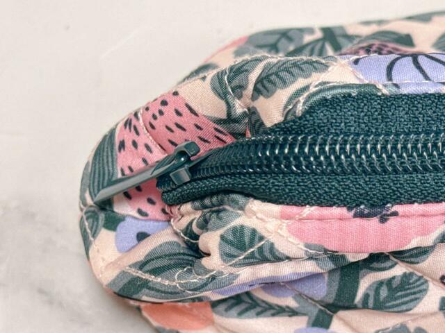 キルティングポーチとお揃いの花柄生地を使用したティッシュポーチ。深みのあるグリーンのファスナーがアクセントになっており、全体の印象を引き締めてくれます。