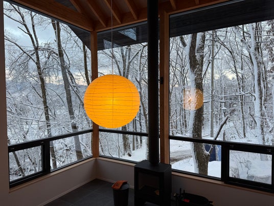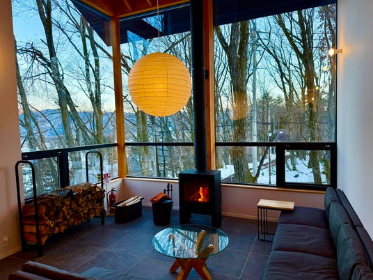 白馬の大自然が見渡せる吹き抜けリビングの大開口、サウナや薪ストーブを備えたプライベートシャレーで過ごす非日常