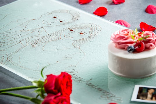 Present 02:Surprise Dessert(似顔絵付きホールケーキ)当日撮影したお写真を元に、熟練のパティシエがチョコペンで描いた似顔絵を添えたスペシャルホールケーキをご用意します。「今の二人」や「今の家族」の笑顔が描かれた世界に一つだけのケーキをお愉しみください。