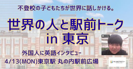 不登校オルタナティブスクール小中一貫校NIJINアカデミー(運営:株式会社NIJIN/所在地:東京都江東区/代表:星野達郎) は、2026年4月13日、東京駅丸の内駅前広場にて、不登校の子どもたちが外国人観光客へ英語でインタビューを行うプロジェクト「世界の人と駅前トーク in 東京」 を実施します。