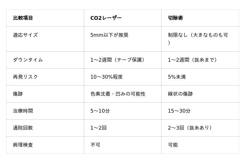 6割以上がCO2レーザーを選択しており、「傷跡が残りにくい」「ダウンタイムが短い」という点が選択の主な理由として挙げられています。一方、切除術を選んだ方は「確実に取り切りたい」「再発が心配」という理由が多く見られました。