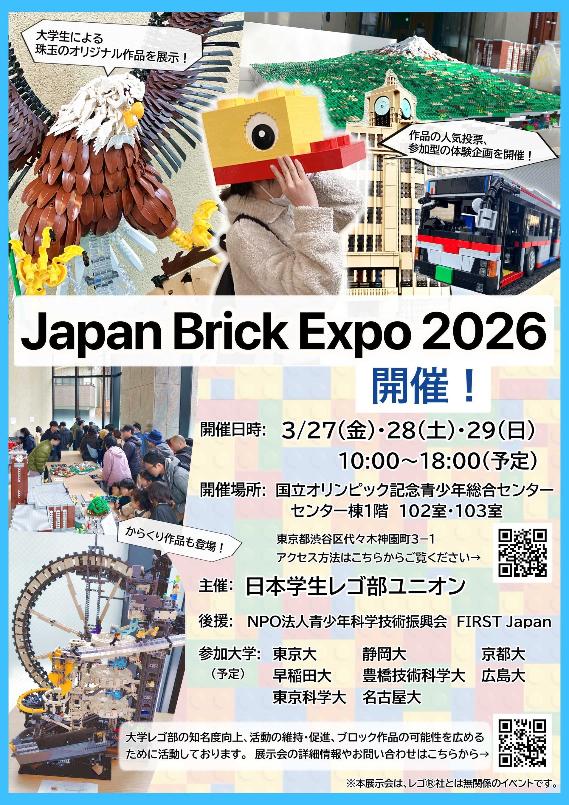 日本学生レゴ部ユニオン(静岡大学レゴ部 部長:佐藤隆貴)はJapan Brick Expo 2026を東京都渋谷区「国立オリンピック記念青少年総合センター棟102室・103室」にて2026年3月27日(金)~29日(日)に開催します。このイベントは、一ブロックを通じて人と企業が集まる事を目的に、全国の大学レゴ部および企業関係者、一般来場者を対象にしたものです。