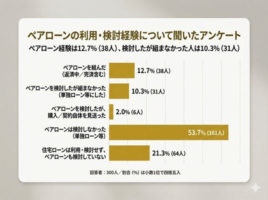 その中で、実際にペアローンを組んだ人は12.7%(38人)にとどまりました。また、ペアローンを検討したものの、単独ローンを選択した人が10.3%(31人)、購入や契約自体を見送った人が2.0%(6人)となり、検討段階で判断を変えた人も一定数存在しています。