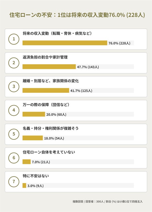 ・住宅ローンの不安1位は将来の収入変動(転職・病気・育休等)76.0%(228人)