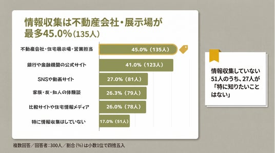一方で、情報収集源としては不動産会社や住宅展示場、営業担当が45.0%(135人)と最も多く、銀行や金融機関の公式サイトも41.0%(123人)と高い割合を占めています。