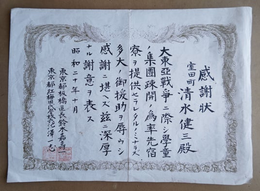感謝状(学童集団疎開の宿寮提供につき) 昭和20年(1945年)10月