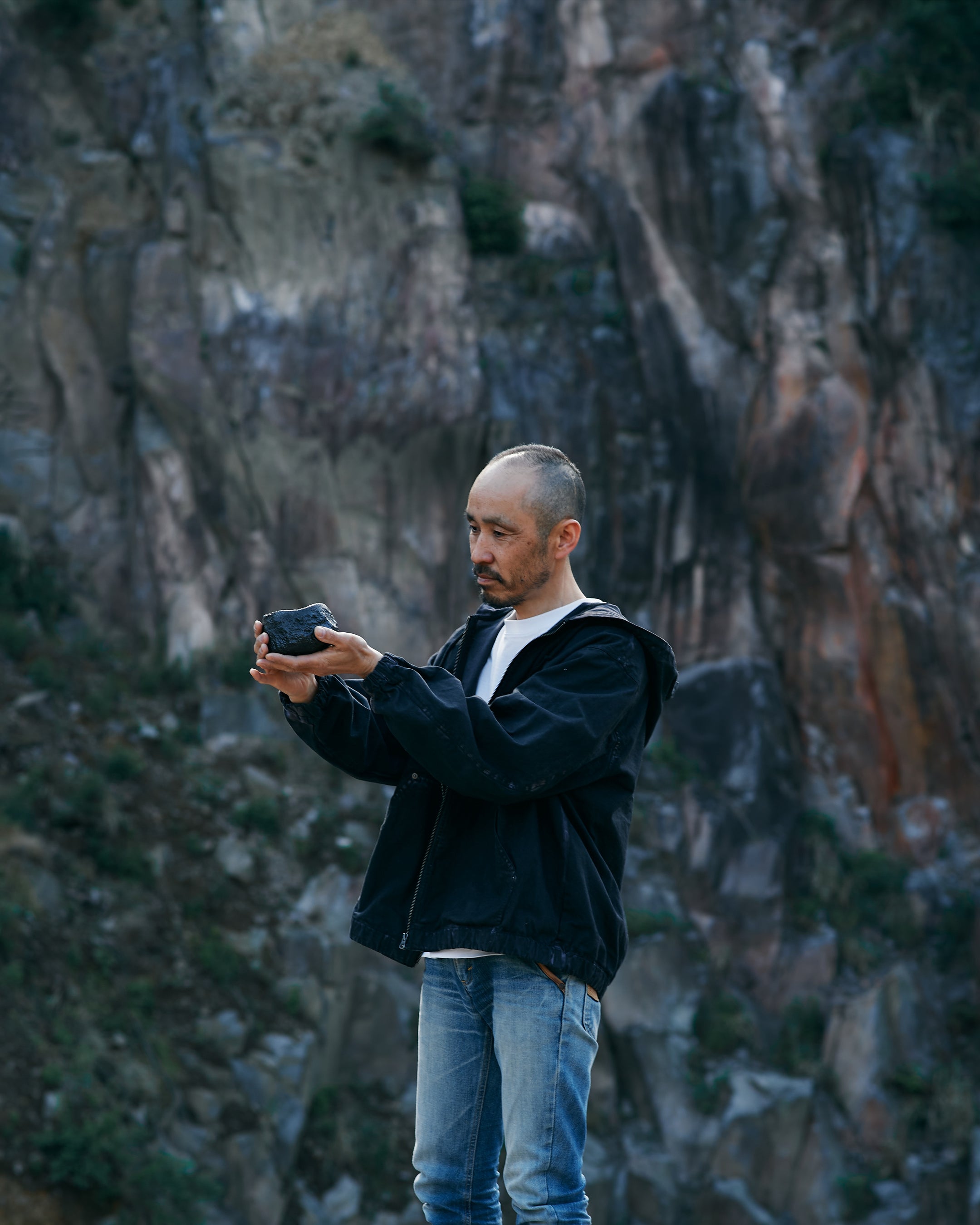 この石をのみと金槌で割り、旋盤で削り出し、1300℃を超える過酷な炎で再び焼き上げます。一度マグマの状態へと還った石から釉薬成分が溶け出し、表面に現れる「景色」は、自然が生み出した偶然の芸術です。