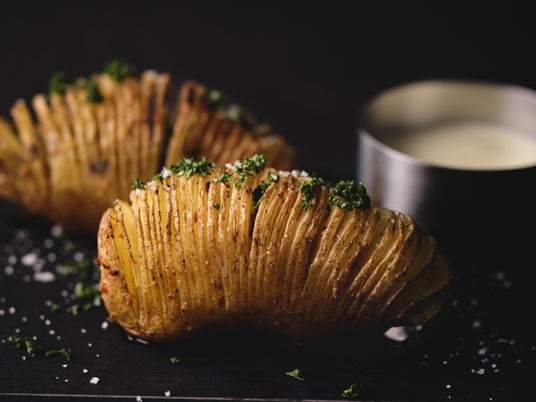 アコーディオンのような華やかな見た目が印象的な北欧の国民食。ポテトソースを添えれば、いも感をぜいたくに楽しめる最強のおつまみに。