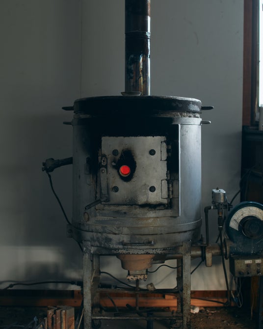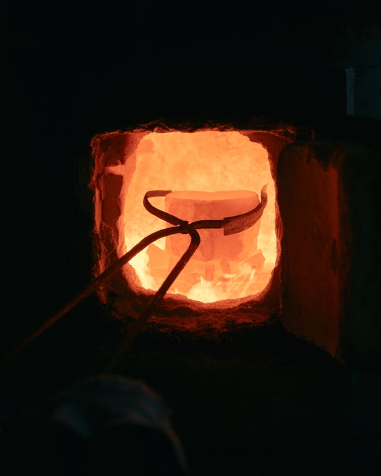 この石をのみと金槌で割り、旋盤で削り出し、1300℃を超える過酷な炎で再び焼き上げます。一度マグマの状態へと還った石から釉薬成分が溶け出し、表面に現れる「景色」は、自然が生み出した偶然の芸術です。