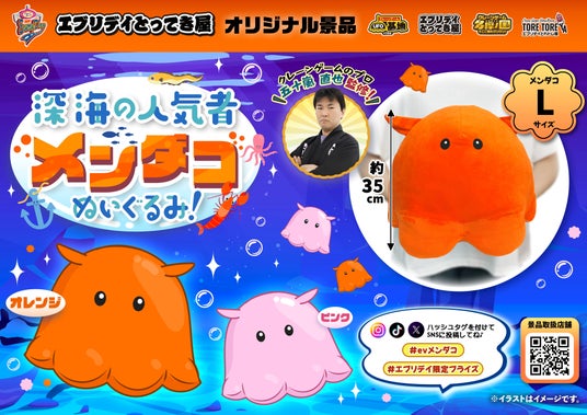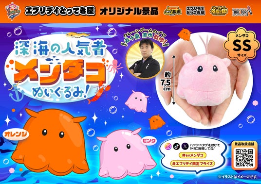 エブリデイとってき屋オリジナル景品として、深海の人気者「メンダコ」がオリジナルぬいぐるみとして登場します。ころんと丸みのあるフォルムと、つぶらな瞳が愛らしいデザインで、思わず手に取りたくなる仕上がりとなっています。また本商品は、クレーンゲームのプロ・五十嵐直也監修のもと企画されたこだわりのオリジナル景品。細部まで作り込まれたデザインと高い完成度で、幅広い世代のお客様にお楽しみいただけるアイテムとなっております。サイズは2種類用意。手のひらに収まるコンパクトサイズのSSサイズはゴム紐がついているため、バッグなどに取り付けて持ち歩くことができます。Lサイズは存在感抜群のビッグサイズで抱き心地も良く、お部屋のインテリアとしてもおすすめです。深海生物ならではのユニークさと癒しを表現した、ここでしか手に入らない限定プライズです。