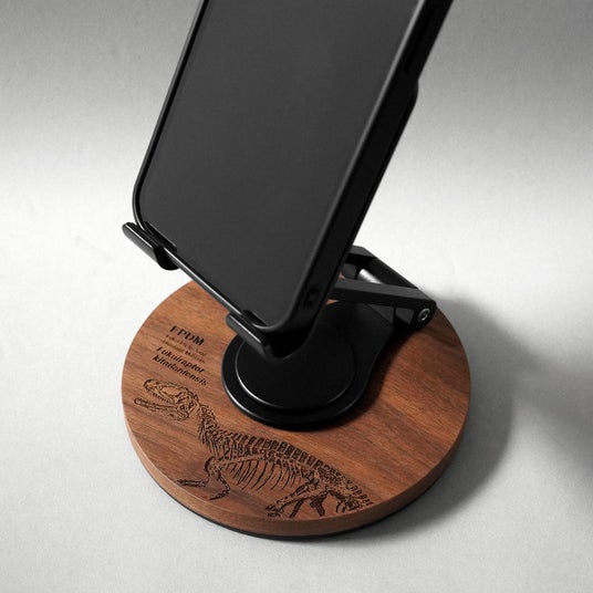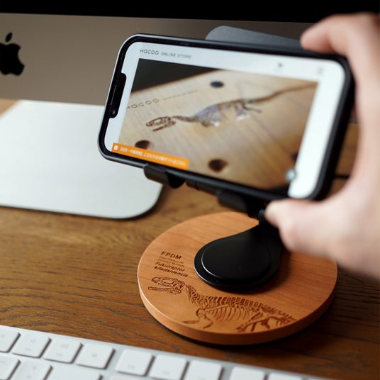 1.Smartphone Stand Adjustable角度調整が可能な重厚感あるスマホスタンド。木部に刻印されたフクイラプトルが、デスクワークを力強くサポートします。