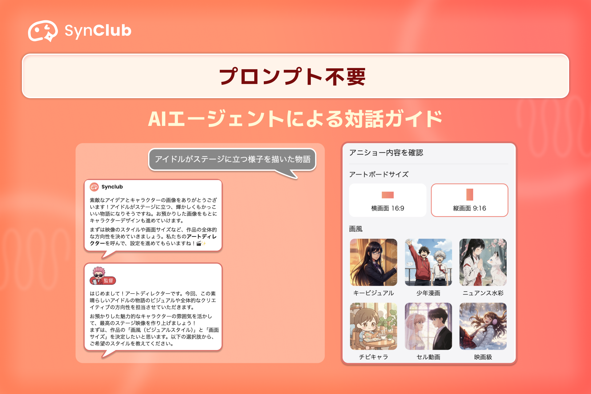 専門用語や複雑なプロンプトは不要。AIエージェントとの対話形式でアイデアを入力するだけで、決められた制作フローに沿って高品質な作品を制作できます。